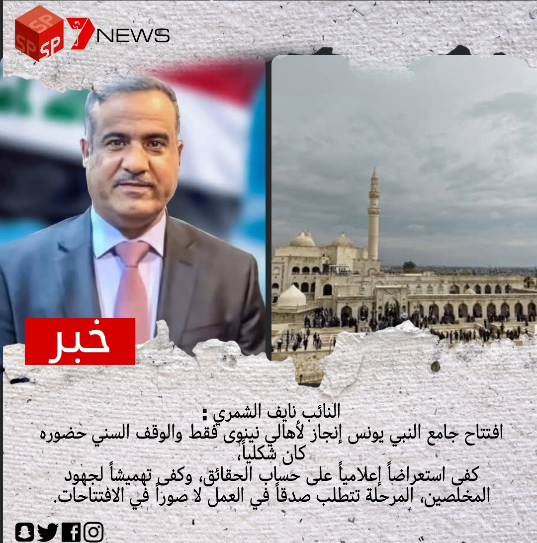 النائب نايف الشمري : افتتاح جامع النبي يونس إنجاز لأهالي نينوى فقط والوقف السني حضوره كان شكلياََ،