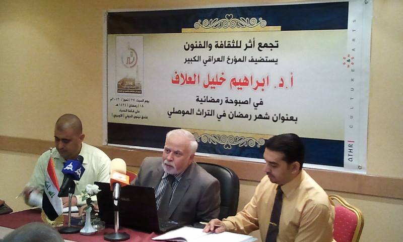 في اطار استمرار الانشطة الثقافية في مدينة الموصل اقام تجمع اثر للثقافة والفنون اصبوحة رمضانية عن التراث الموصلي في شهر رمضان ،و القى محاضرتها الاستاذ العلامة الدكتور ابراهيم خليل العلاف ،المؤرخ التاريخي ورئيس اتحاد ادباء وكتاب الانترنيت .